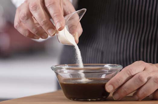 2. Soften the gelatine sheets in cold water and melt them in the hot coffee.